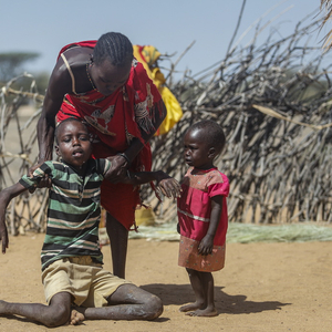 当地时间2022年5月12日,肯尼亚Lomoputh,一位母亲扶着营养不良的儿子站起来。