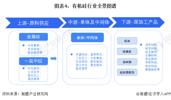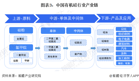 有机硅产业链分为有机硅原料、有机硅单体、有机硅中间体和有机硅深加工产品四个环节。有机硅产品繁多,主要为根据不同用途研发的有机硅深加工产品,上游有机硅原料、有机硅单体和有机硅中间体品种规格较少。其产业链如下图所示: