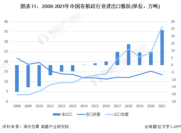 根据海关总署统计数据,2008-2021年初级形状的聚硅氧烷进口数量波动下降,进口数量波动上升,其中2014年我国初级形状的聚硅氧烷首次实现净出口。2021年我国初级形状的聚硅氧烷进口数量为13.4万吨,出口数量为37.6万吨,实现净出口24.2万吨,达近年最大值。