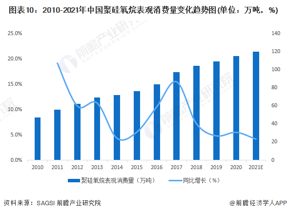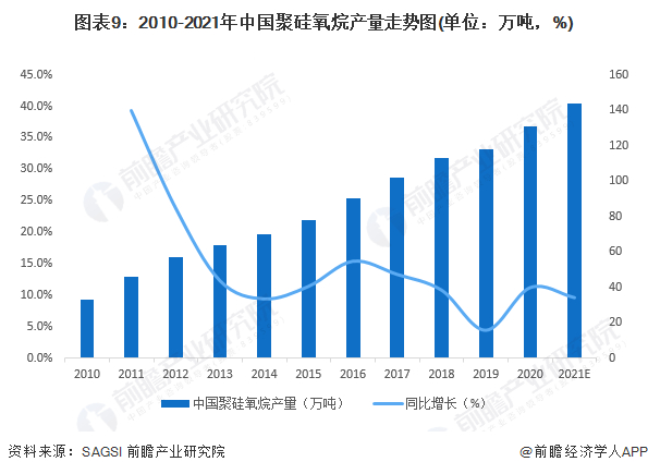根据全国硅产业绿色发展战略联盟(SAGSI)统计数据,2010-2019年中国聚硅氧烷产量不断增长,2019年中国聚硅氧烷产量为118.0万吨,同比增长4.42%。前瞻结合有机硅单体产量情况测算(根据不同生产水平,有机硅单体和聚硅氧烷折算比约在0.45-0.47之间),2020-2021年,中国聚硅氧烷产量持续增长,2021年中国聚硅氧烷产量达144万吨,同比增长9.6%。