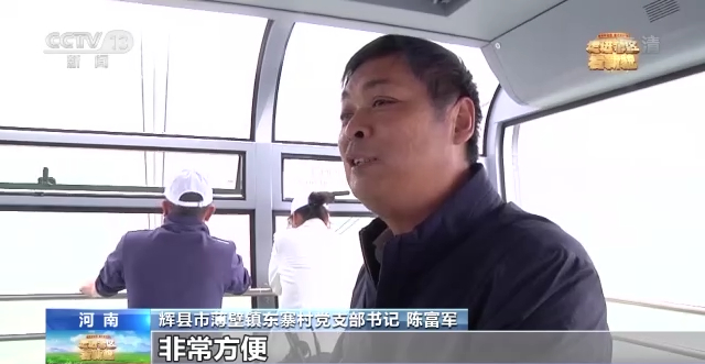 河南省辉县市薄壁镇东寨村党支部书记 陈富军:原来从山上去乡镇上看病、买生活用品,(来回)得一天时间。现在坐着这个索道,三分钟下来,非常方便,关键还不要钱。