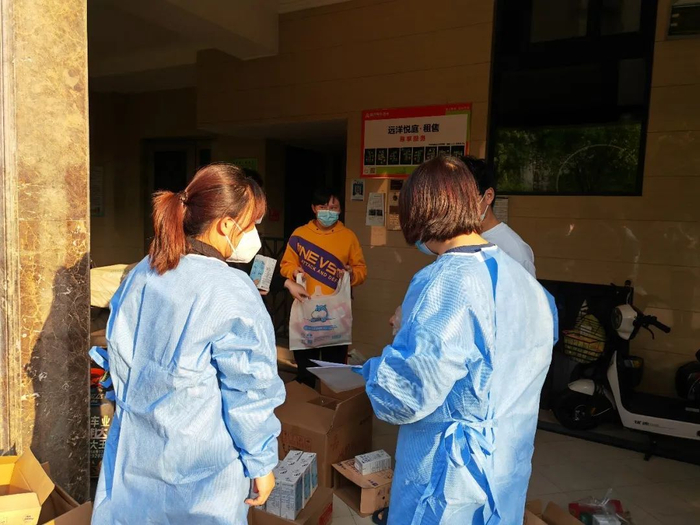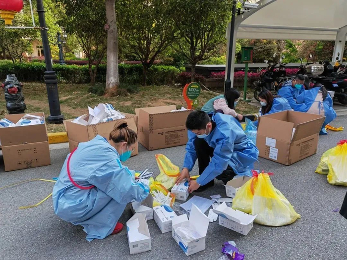 核酸检测时他们在微信群里通知居民下楼,做好登记,提醒居民准备好核酸检测二维码,不厌其烦。抗原检测时他们负责在楼道内逐户分发抗原、统计结果。