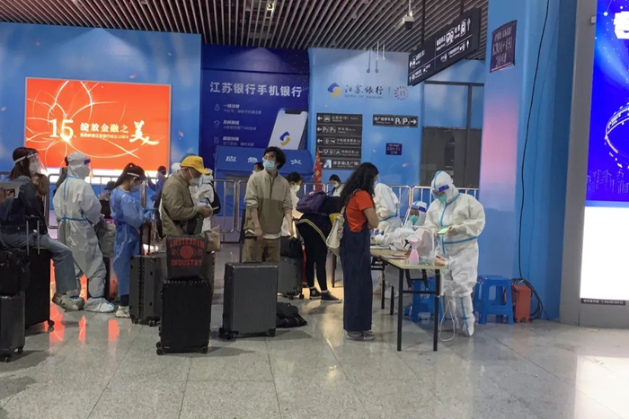 从上海到南京的乘客被集中安排在了两节车厢。下午六点半,高铁到达南京南站,工作人员用警戒线将离沪乘客和其他车厢的乘客隔开。在工作人员带领下,王雯雯和其他离沪乘客走内环转运通道到登记点,按照登记的信息,当天中转和隔天中转的乘客被分成两批。