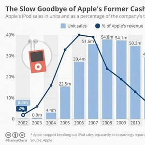 的确,iPod取得了前所未有的成功。在2002财年,它的销售收入达到了1.43亿美元,成绩已然不菲。到了2004财年,在iTunes的加持下,iPod的销售收入一跃升至13亿美元。2005财年,iPod 的收入超过45亿美元,成为苹果公司收入最高的产品。