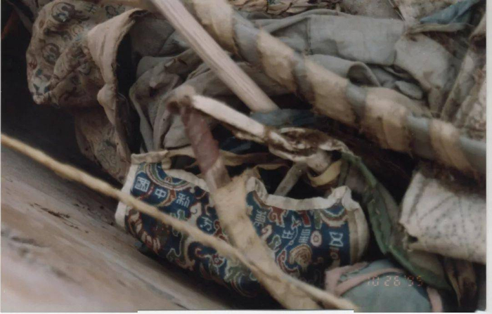 在发掘工作到8号墓的时候,考古队员发现顶部上散乱些木棒,杂草,照相后清除杂草,便见到了木棺顶部覆盖的毛毡毯,毡毯较厚,其上有花纹,但糟朽严重,一触即破。处理完表层,大家都抱着期待的心情准备开棺。