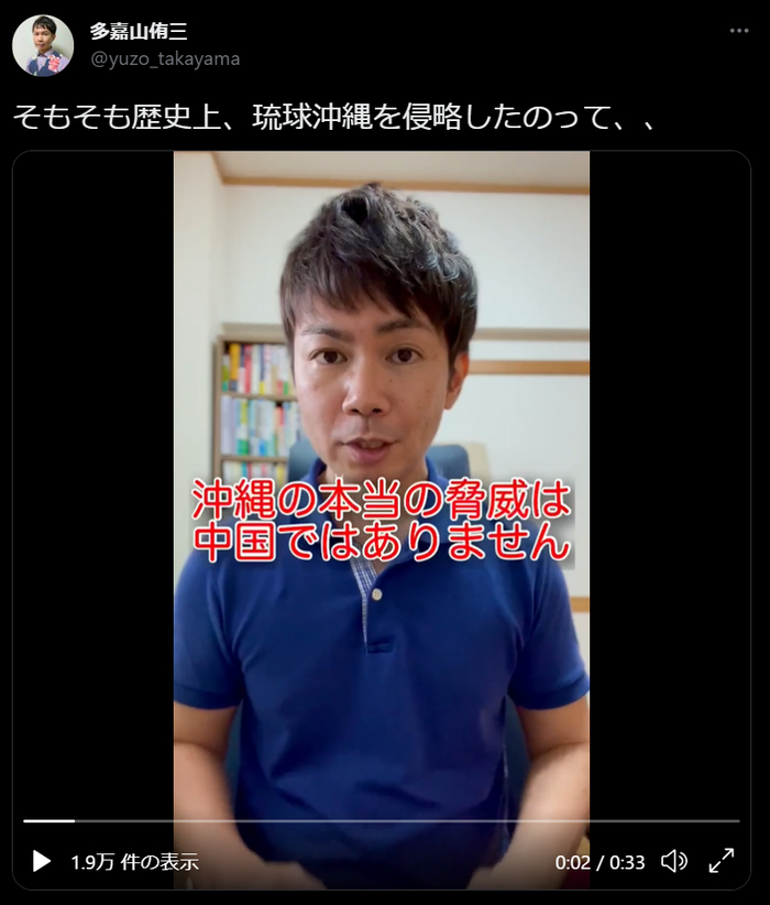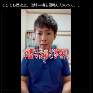 多嘉山侑三在视频中说道:冲绳真正的威胁不是中国!以自民党的政治家为首,不负责任地煽动中国大陆和台湾的内部矛盾,和美国一起军事介入,在琉球列岛上强行推进建设美军基地和自卫队基地,试图再次将冲绳变成战场。