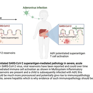 在感染新冠病毒后,病毒库可能会随着时间的推移导致反复的超级抗原介导的免疫细胞激活,如多系统炎症综合征(MIS-C)。如果存在此类病毒库,并且儿童随后感染了腺病毒(AdV),这种超抗原介导的影响可能会更加明显,并可能导致免疫异常,如最近报告的急性重度肝炎,这就是为什么在这些病例中应该调查这种免疫病理学的证据。