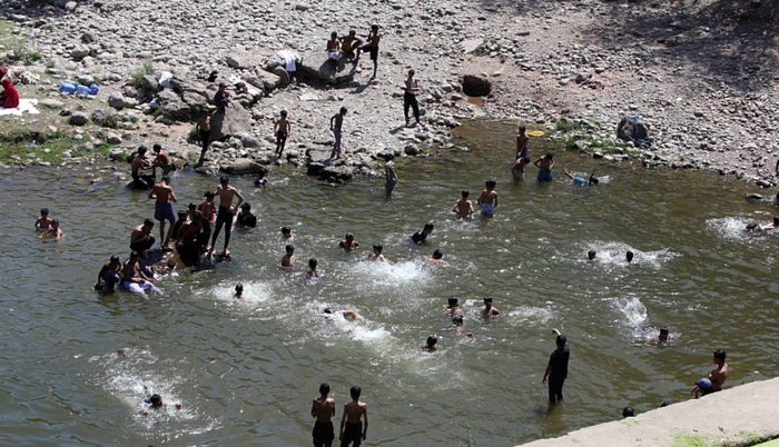 当地时间5月14日,巴基斯坦海得拉巴民众跳入河里降温。