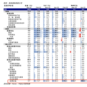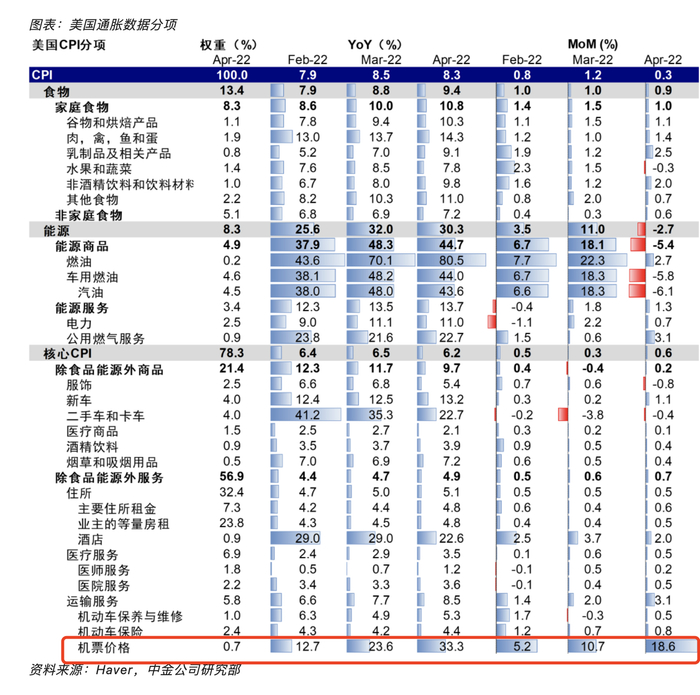 中金指出,线下出行需求激增是通胀的主要贡献,线下高频数据显示TSA安检人数已经接近疫情前水平,酒店入住率提升至64%(2019年同期为68.4%),但机票涨幅远超酒店,这与此前航油价格大涨密不可分。