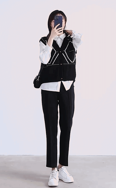 针织马甲和平底鞋,瞬间将距离感减小,亲和力拉满,整个人如沐春风般舒服。