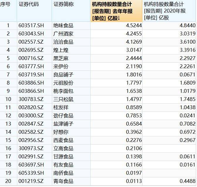 (休闲食品板块2021年机构持股数量)