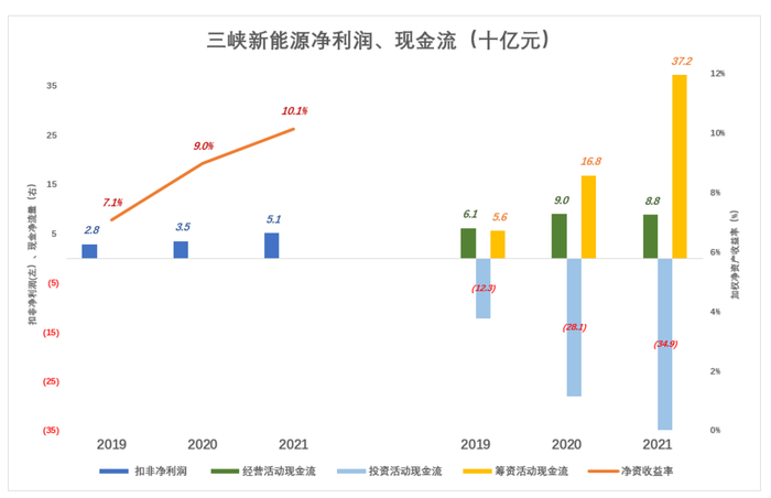 2021年,三峡新能源经营活动现金净流入88.2亿,投资活动净流出349亿、几乎是经营现金流入的4倍。筹资活动现金净流入372亿。