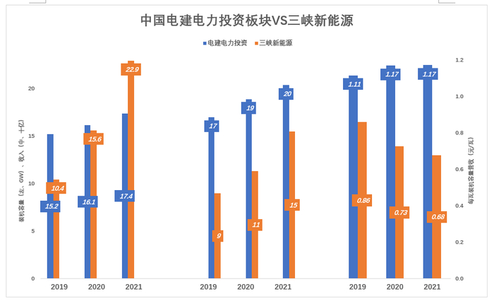 2021年,三峡新能源装机容量暴涨至22.9GW,营收155亿、每瓦年入0.68元;电建投资营收203亿、每瓦年入仍为1.17元,比三峡新能源高73.1%。