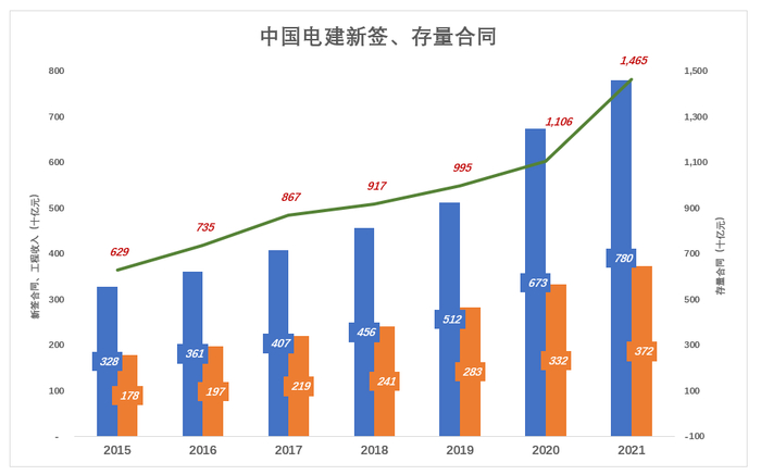 2021年,中国电建新签合同7802亿元,同比增长15.9%;工程收入3723亿(相当于完成合同),同比增长12%;年末在手合同总金额达1.46万亿,同比增长32.4%。