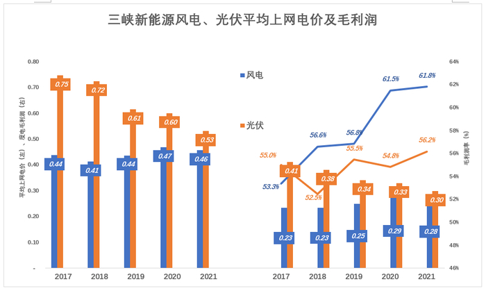 先看光伏:2017年,度电收入0.75元、2019年0.61元、2021年0.52元。度电毛利润亦逐年下滑:2017年0.41元、2019年0.34元、2021年0.29元。好在毛利润率一直保持在55%一线。