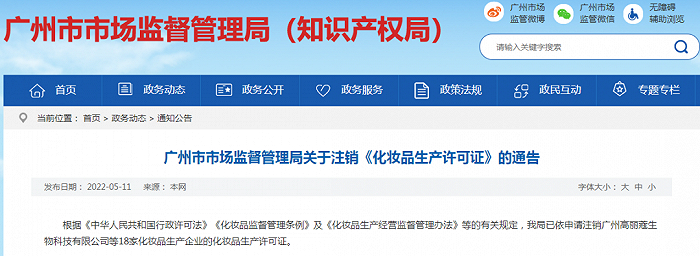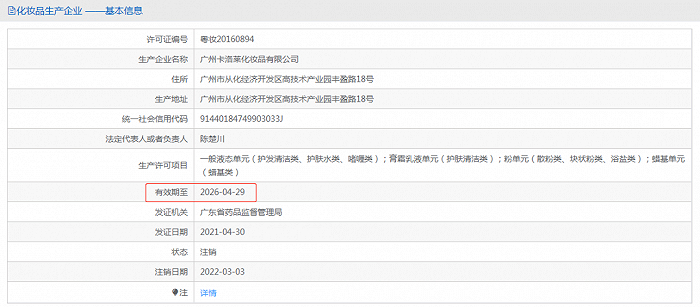 5月11日,广州市场监管局发布通告,依申请注销广州高丽蔻生物科技有限公司等18家化妆品生产企业的化妆品生产许可证,全部是企业主动注销。其中,卡洛莱许可证有效期至2026年4月,也已于今年3月份注销。