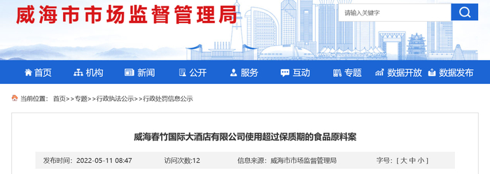 中国质量新闻网讯 2022年5月11日,山东省威海市市场监督管理局网站公示关于威海春竹国际大酒店有限公司使用超过保质期的食品原料案的行政处罚信息。
