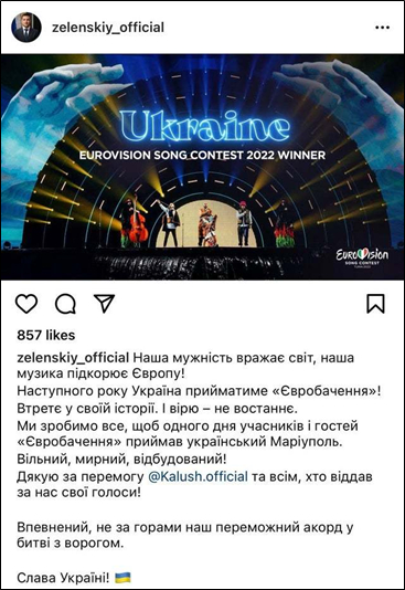 乌克兰总统泽连斯基也在网上发文祝贺本国选手,并骄傲地宣称:“我们的勇气惊艳了世界,我们的音乐征服了欧洲!”