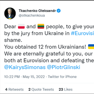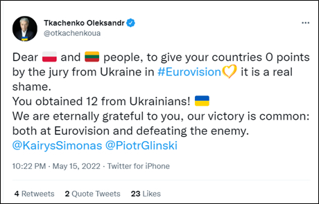 5月15日,乌克兰文化与信息部长特卡琴科在社交平台向立陶宛、波兰民众发文表示:“在欧洲歌唱大赛上,来自乌克兰的评委给你们两国选手打了零分,这是耻辱,乌克兰人给你们打12分。”