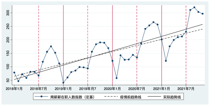 图2:“周薪薪”在职人数月度变化。注:我们将在职人数进行了指数化处理,指数化的方式是以 2018 年全年平均的月度在职人数为基数,所有月份实际的在职人数相对于该基数的百分比即为在职人数指数。疫情前趋势线采用的是2020年1月之前的月度数据,实际趋势线采用的是整个观测期间的月度数据,趋势线绘制采用的方法是将所有企业的加总月度数据和月份进行简单的线性拟合。图3和图4的处理方式与图2类似。
