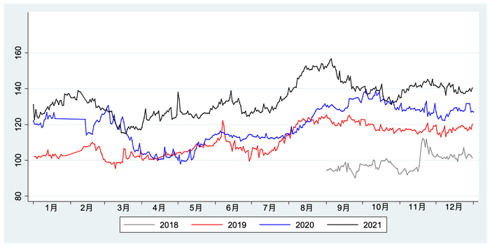在图6中,我们可以看到,2020年4-8月,制造业劳动力市场的情况确实较差,但9月后即迅速恢复;我们也能看到,2021年10月国外疫情带来的冲击,在年底之前也有一定程度恢复;同时,2021年的整体状况,比2020年好得多。由于采用的数据是可以实时获得的,因此,本指数比其他数据能更为及时地反映宏观经济状况。