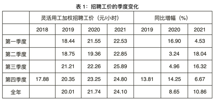 首先,灵活用工市场存在着非常明显的季节性特征。如图2-图5所示,在职人数、计薪天数和灵活用工价格都表现出明显的季节性特征。每年上半年为求职和用工的淡季。从九月开始,求职人数和用工数量都会出现较大幅的上升,旺季会持续到每年十二月。每年二月份,由于春节假期和务工者返乡的影响,求职人数和用工需求处于当年最低位。灵活用工价格也体现出季节性特征:总体而言,在同一年份,上半年的用工价格呈逐月下降趋势,年中开始逐渐走高,并在较高位置维持到春节之后。但由于求职人数和用工需求的同向波动,灵活用工价格的季节性波动幅度并没有求职人数和用工需求来得大。其次,用工价格在三年内呈现出上升趋势。从图4和图5可以看到用工价格在三年内的增长趋势。表1展示了季度平均的招聘工价,显示2020年和2021年其同比增幅分别为8.65%和10.86%。在我们的数据中,用工价格上升可能由两方面因素驱动。一是最低工资的上涨推动的工价上升,二是劳动需求相对劳动供给更快的增长引起的工价上升。作为数据最主要来源地的苏州市,在2019-2020年并未发生最低工资调整。 同时,根据第七次人口普查数据,全国层面的流动人口规模和昆山市的人口规模,过去十年间都经历了较大幅度增长。因此,2019-2021年期间用工价格的总体上升趋势,更可能反映了低技能劳动力需求的快速上涨。