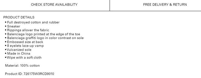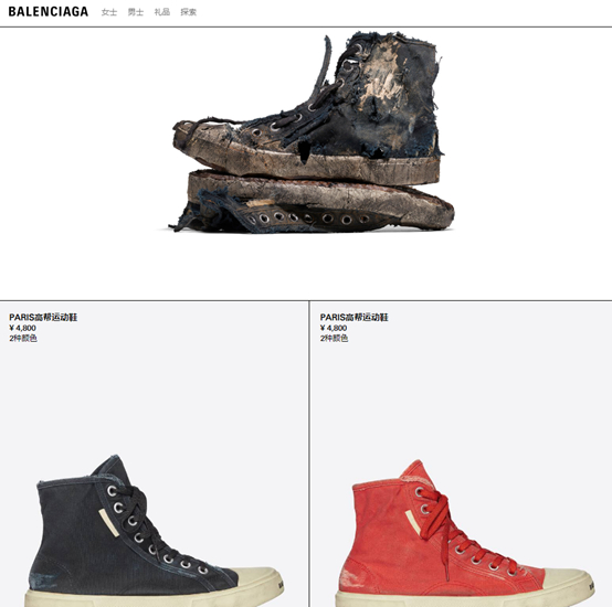 在巴黎世家美国版官网,这款鞋名为限量版完全摧毁PARIS高帮运动鞋,介绍中明确标注,“全毁掉的棉布和橡胶”,“布料撕裂”等字样。据其官网标注,这款运动鞋系在中国制造。
