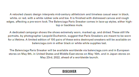 据介绍,“巴黎世家PARIS运动鞋将于2022年5月9日在全球通过balenciaga.com和欧洲门店销售,5月16日在美国和中东门店销售,5月23日在日本门店销售,之后将在全球发售。”