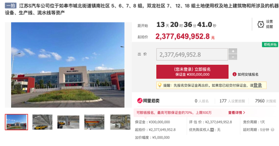 阿里拍卖官网显示,江苏南通中级法院对江苏S汽车位于如皋市的土地使用权、地上建筑物以及所涉及的机器设备、生产线、流水线等资产发起拍卖。