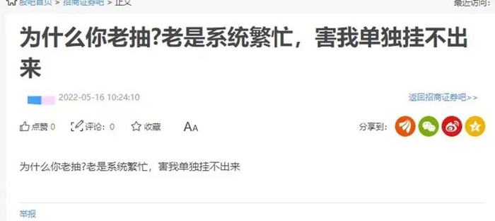 5月16日早晨开盘后,有投资者在股吧反映称,招商证券系统再次崩溃,PC与APP端均无法登陆。还有投资者反映“卸载了登录也不行,页面卡顿。”这已是招商证券系统两个月来第二次发生崩溃。