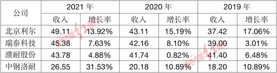 从表1看出,中钢洛耐2019年和2020年营收还不到前三家的一半,但2021年随着增速大幅提高,营收均超过它们的一半。从营收增长率看,2019年和2020年中钢洛耐营收增长比较稳定,均为10.89%。值得注意的是,中钢洛耐的增速在2021年出现异常,与其他三家保持增速低波动不同,中钢洛耐营收增速高达31.53%。公司招股书给出的解释是受益于产能置换和大修理,并且强调公司把主要精力用于开拓新建产能这个领域。但耐火材料本来就是主要用于新建产能和大修理,日常用的量并不大,所以大家的主要销售方向差别应该不大,中钢洛耐能取得比同行高出这么多的增速确实令人难以理解。