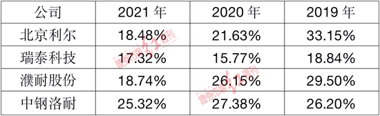 不仅营收增速显著优于竞争对手,中钢洛耐的扣非净利润也表现“突出”(如表2所示)。中钢洛耐2020年扣非净利润暴增123.33%,而当年的营收只增长了10.89%,差别巨大。虽然2021年公司扣非只增长了24.50%,但也明显高于北京利尔和濮耐股份(瑞泰科技因为基数较小而增速较高)。为何中钢洛耐能在竞争对手表现都一般的市场环境下,独自表现得如此突出?从公司披露的信息中我们依然难以找到明确的解释。