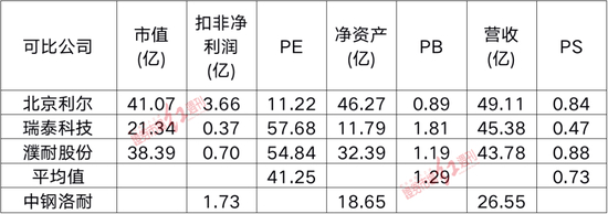 中钢洛耐招股书选取北京利尔、瑞泰科技、濮耐股份等三家公司作为可比公司,我们直接用它们作为估值参考。选用PE、PB、PS三种相对估值法;市值选取2022年5月13日收盘数据,财务数据选取2021年报数据。