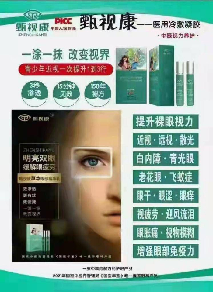 甄视康代理商王某则通过微信公众号“甄视康市场部”介绍,甄视康是械字号产品,由40多味中药材科学配伍,主要作用有:调理眼干、眼涩、近视、青光眼、白内障、飞蚊症、老花眼、黄斑病变等眼疾问题。甄视康见效快,3-5秒透皮吸收,闭目休息15分钟提升裸眼视力1-3行。