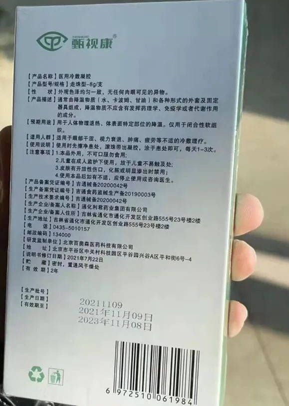 甄视康产品外包装显示,该产品为“医用冷敷凝胶”,用于人体物理退热、体表面特定部位的降温。适用于眼部干涩、视力衰退、肿痛等不适的冷敷理疗。产品备案编号为吉通械备20200042号,属于第一类医疗器械。