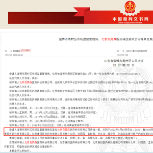 此外,执行裁定书((2022)鲁0306执保462号之一)显示,淄博市周村区市场监督管理局在查处百奥森医药公司传销一案,根据生效的(2022)鲁0306执保462号执行裁定书执行。
