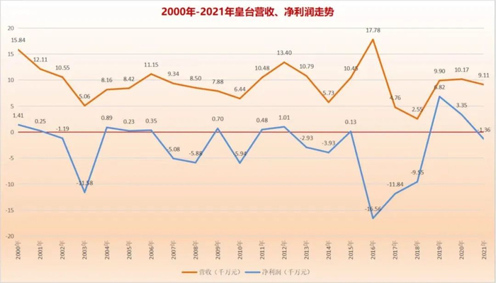 谁曾想,22年后的今天,皇台酒业交出的成绩单竟然不及当年。2021年,皇台酒业营收9108.81万元,净利润-1355.48万元。