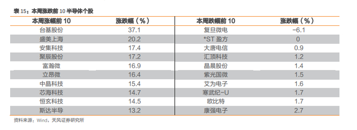 本周半导体板块涨幅前10的个股为:台基股份、盛美上海、安集科技、聚辰股份、富瀚微、立昂微、中晶科技、芯海科技、恒玄科技、斯达半导。