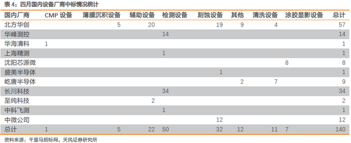 从设备中标情况来看,2022年4月北方华创中标57台和长川公司中标34台设备中标量最大。北方华创、芯源微等成功中标上海积塔特色工艺生产线,国产设备比重较大。我们统计4月设备厂商中标情况,其中华天科技、上海积塔、华虹半导、福建晋华都引入了多台国产设备,北方华创和中微公司刻蚀设备中标量最大,北方华创中标5台薄膜沉积设备,20台辅助设备,19台刻蚀设备,4台清洗设备及9台其他设备,其中27台中标积塔半导体项目。长川科技34台检测设备中标华天科技和景嘉微项目。华峰测控14台检测设备中标华天科技项目。中微公司12台刻蚀设备中标华虹半导体(无锡)项目。分设备看,干法去胶设备、刻蚀设备、清洗设备、离子注入机、抛光设备、涂胶显影设备是国产化集中领域。