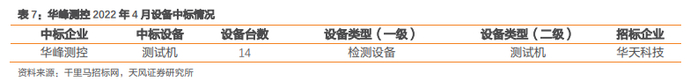 华峰测控2022年4月中标设备数为14台,中标设备全部为检测设备,系华天科技所用的测试机。