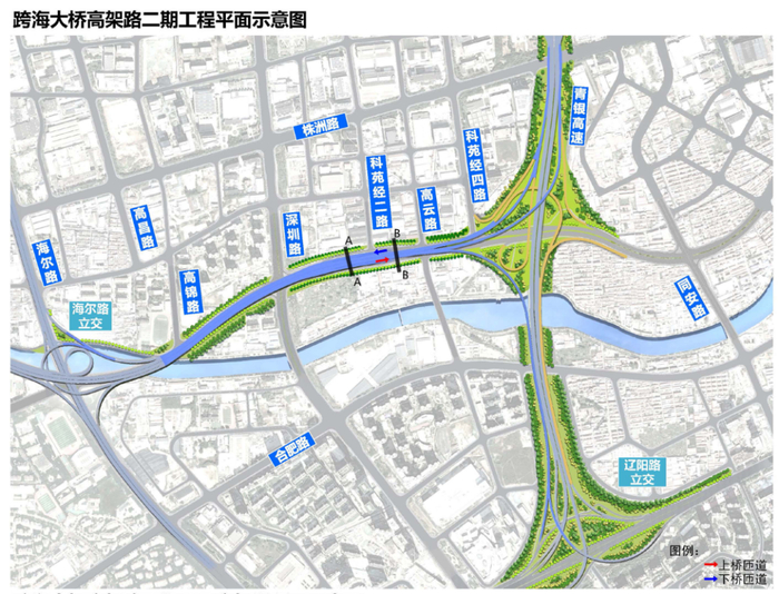 根据图示,跨海大桥高架路二期工程主线自海尔路立交与一期工程预留段衔接,向东采用双向6车道高架跨过深圳路后,采用定向+环形立交与青银高速衔接,在深圳路东侧设置一对双车道接地匝道。