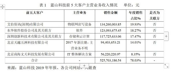 如表1所示,该公司与前五大客户的年销售交易金额合计占全年销售金额的78.03%,通过查看其前五大客户各自的2019年度供应商名单及相应采购金额,艾伯资讯(深圳)有限公司的采购金额为7945.61万元、东华博育云有限公司(东华软件股份公司的子公司)的采购金额为9794.37万元、深圳创新科技术有限公司的采购金额为3618.34万元,均远小于蓝山科技2019年财务报表中所披露的销售额;另外,北京商海文天科技发展有限公司2019年供应商名单中并无蓝山科技,而这家企业2017年仅有蓝山科技一位供应商,我们有理由怀疑蓝山科技参照过往销售经验来虚增销售业务,而证监会的处罚决定书也证实了我们的怀疑。