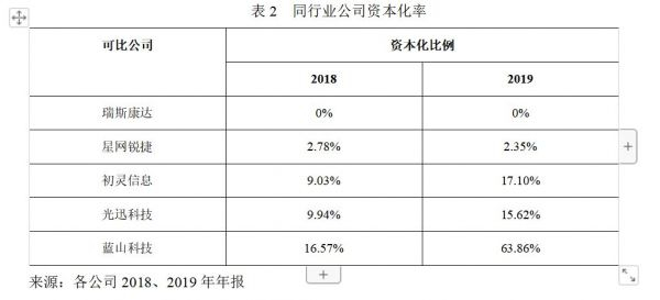 根据企业会计准则规定,研发费用资本化要求是极高的,需证明该无形资产生产的产品存在市场或无形资产自身存在市场;具有完成该无形资产并使用或出售的意图。大多数企业基于会计谨慎性原则,几乎对研发支出采用费用化处理。如表2所示,蓝山科技2019年资本化率高达63.86%,远远高于同行业其他公司,其账务处理的真实性及合理性值得怀疑。
