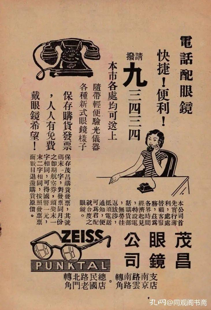 “本公司首先实行薄利,处处替顾客服务,兹为各界经济时间起见,特设电话购物部,无劳往返跋涉,只需电话通知,便可为君配就合度之眼镜。”