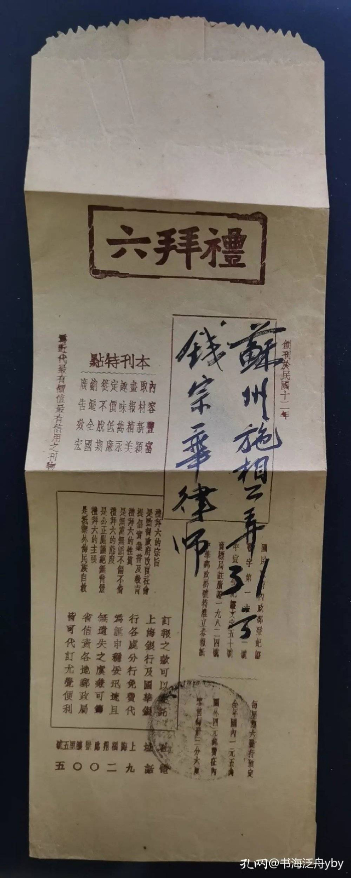 《礼拜六》杂志社信封上介绍了该杂志创刊于民国十二年,为近代最有价值,最有信用之刊物,杂志特点是内容丰富,取材新颖,画报精美,趣味隽永,定价低廉,从不脱期,销遍全国,广告效宏。杂志宗旨是监督政府,改良社会,提倡实业,普及教育。另外介绍了订阅办法。