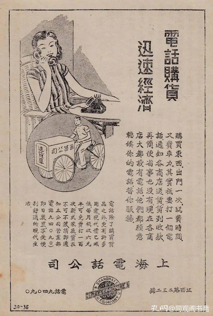 广告右边写着:“购买东西出门一次,既费时间,又费车力,其实打一个电话,通知各商店送货,货到收款,简便省事,现在各商店大都设有电话,他们都愿意听候你的电话,替你服务。”