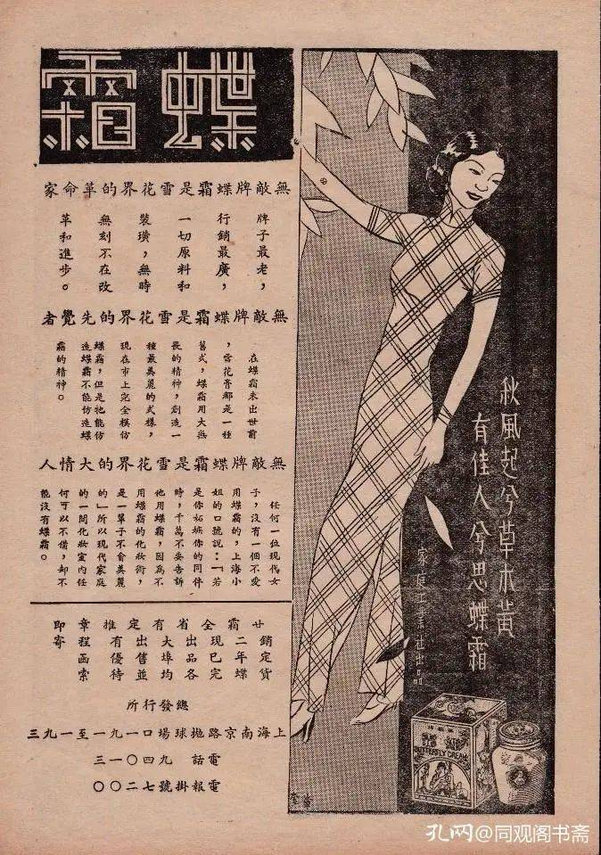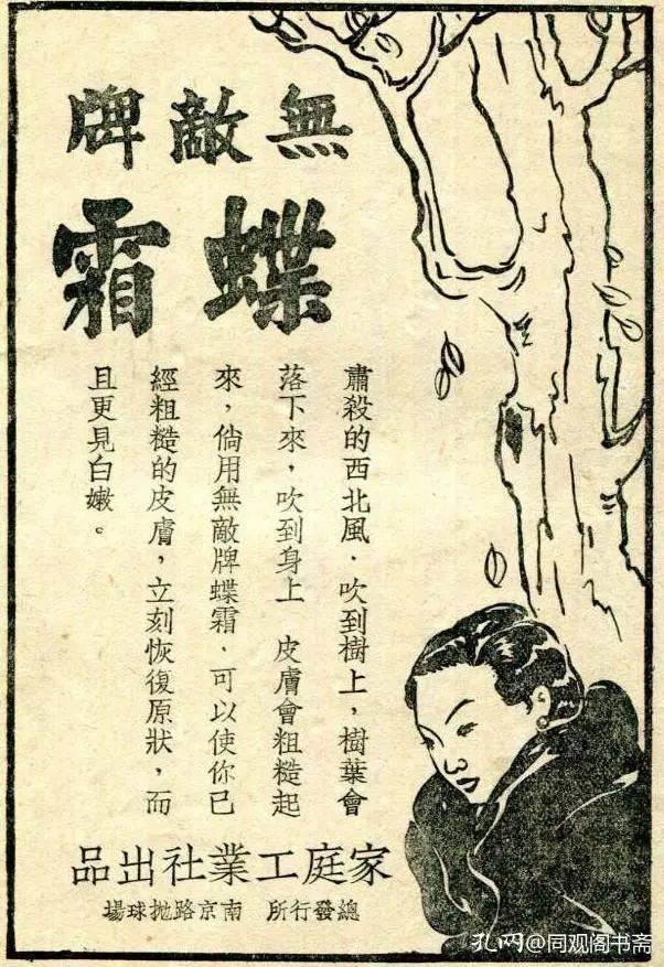 还有一张广告:一位穿旗袍的摩登女郎,旁边写有:“秋风起兮草木黄,有佳人兮思蝶霜”——家庭工业社出品。广告词比喻说明无敌牌“蝶霜”的独到之处,是现代女子的必备化妆品。