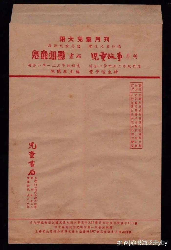 上海儿童书局广告信封,介绍了书局出版的两大儿童月刊,《儿童知识》画报和《儿童故事》月刊。刊物以启发儿童思想,增进儿童知识为目的。由陈鹤琴主编,丰子恺主绘。信封另一面还介绍了最近新书。