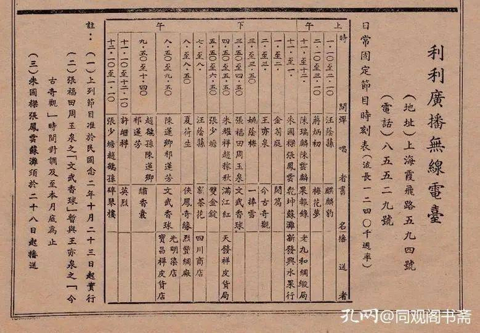 另一家“利利广播无线电台”,从这张该电台广播节目表中,我们可以看到:播送者(应该是我们今天的赞助商)推出著名弹唱者在广播中弹唱说书,有老九和绸缎局、新发兴水果行、天发祥皮货局、四川商店、烈丰绸厂、光明染店、宝昌行皮货店。想象当年在播出弹唱的前后及中间,肯定要插播很多这些商家商号的广告,广播广告带来的效益是可想而知的。