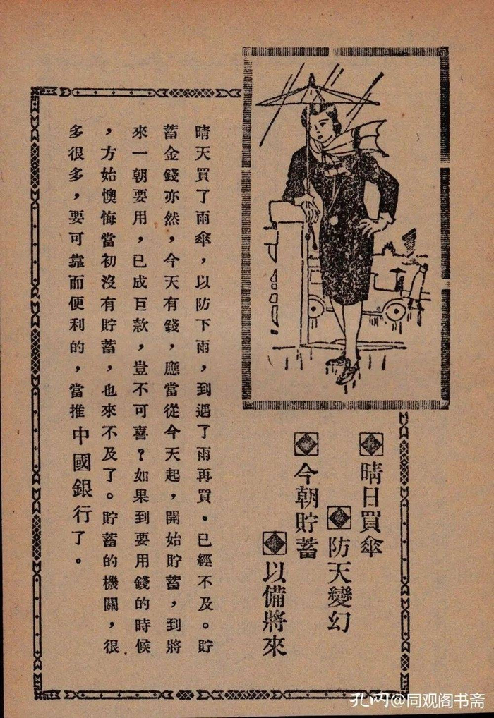 中国银行于1912年由孙中山批准成立,是我国历史最悠久的银行。这张中国银行广告,画面是一位时尚女郎倚立在桥边,手打一把雨伞,远处有被雨淋的匆匆过客。广告词设计把“伞”与“储蓄”巧妙地联系在一起:“晴天买伞,防天变幻;今朝储蓄,以备将来”。